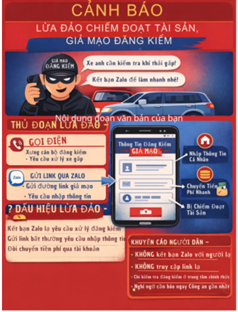 Khi có nhu cầu liên quan đến đăng kiểm hoặc cần giải đáp thông tin, người dân nên liên hệ trực tiếp các trung tâm đăng kiểm hợp pháp hoặc các kênh thông tin chính thống để được hướng dẫn. Mỗi người dân cần chủ động bảo vệ thông tin cá nhân, đồng thời chia sẻ, cảnh báo cho người thân, bạn bè nhằm tránh trở thành nạn nhân của các hành vi lừa đảo trên không gian mạng.