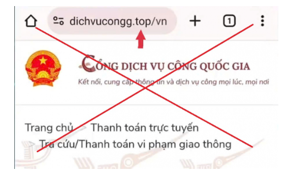 Đường link giả mạo có giao diện bắt chước Cổng Dịch vụ công Quốc gia nhưng tên miền bị sai lệch. Ví dụ: dư chữ “g” ở cuối hoặc chèn cụm từ lạ như “top/” hay thêm các ký tự đặc biệt, dấu chấm…