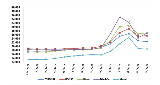 Theo thông tin từ Cục Quản lý và Phát triển thị trường trong nước, thống kê các kỳ điều hành bất thường gần đây đối với hai mặt hàng tiêu dùng phổ biến, giá cơ sở xăng RON95 đã có 3 kỳ tăng liên tiếp vào các ngày 5, 7 và 10.3.2026, với mức tăng lần lượt 10,86%, 21,07% và 22,45%. Giá cơ sở dầu diesel cũng tăng trong cả 3 kỳ tương ứng 19,49%, 31,26% và 18,12%.