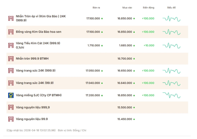 Bảng giá vàng chi tiết phiên chiều ngày 18/4/2026 (Đơn vị: Triệu đồng/lượng)