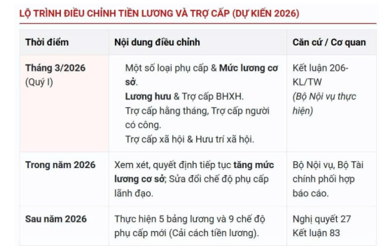 Trong tháng 3/2026, Chính phủ yêu cầu Bộ Nội vụ thực hiện điều chỉnh mức lương cơ sở, lương hưu và trợ cấp BHXH theo Kết luận 206 của Bộ Chính trị.