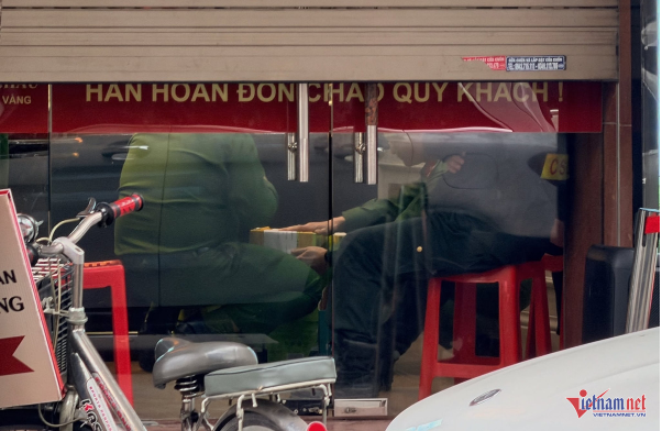 Tại cửa hàng, cửa cuốn được kéo xuống. Nhiều cán bộ công an liên tục ra vào, khiến người dân xung quanh chú ý.