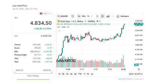 Trên thị trường quốc tế, giá vàng giao ngay ghi nhận lúc 6h50 giao dịch ở mức 4.835 USD/ounce, tăng mạnh 2,75% so với mức đóng cửa hôm qua.