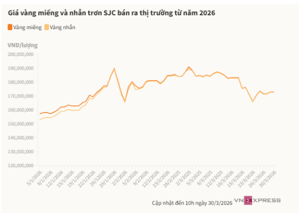 Bước sang phiên đầu tuần mới ngày 30/3, thị trường nhanh chóng cho thấy sự mong manh của đà phục hồi. Giá vàng giao ngay có thời điểm giảm gần 70 USD, tương đương 1,2%, xuống dưới 4.430 USD/ounce, sau đó lại bật lên vượt 4.500 USD/ounce. Trong nước, vàng SJC và vàng nhẫn vẫn ở quanh ngưỡng 170-173 triệu đồng/lượng.