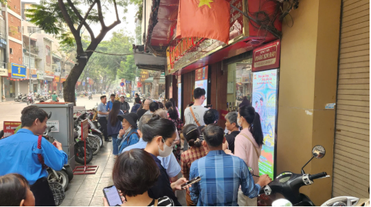 Hàng dài người mua vàng chờ đợi từ trước khi cửa hàng Bảo Tín Minh Châu mở cửa giao dịch trong sáng nay 7/4. Ảnh: Thái Nguyễn