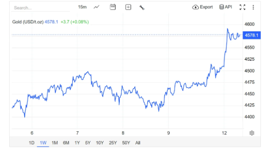 Giá vàng thế giới giao ngay trên thị trường châu Á lúc 13 giờ 45 ngày 12/1 (giờ Việt Nam) giao dịch ở quanh ngưỡng 4.578 USD/ounce, tăng mạnh 68 USD/ounce so với chốt tuần vừa qua.