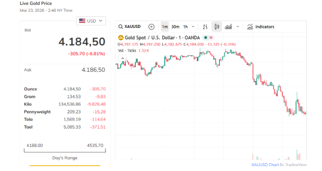 Giá vàng thế giới giảm sâu chiều 23/3 (giờ Việt Nam). Ảnh chụp màn hình Kitco