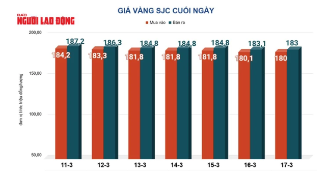 Tính đến 6 giờ 30 phút sáng ngày 18/3, giá vàng miếng SJC tại Tập đoàn Doji ở Hà Nội và TP.HCM giao dịch ở quanh mức 180 – 183 triệu đồng/lượng (mua – bán), giảm 100.000 đồng/lượng ở chiều mua vào và chiều bán ra so với cùng thời điểm hôm qua. Chênh lệch mua bán ở mức 3 triệu đồng/lượng.