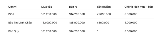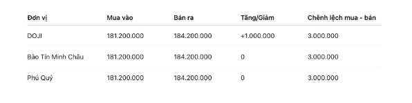 Tính đến 9h00, giá vàng miếng SJC được Tập đoàn DOJI niêm yết ở ngưỡng 181,2-184,2 triệu đồng/lượng (mua vào – bán ra), tăng 1 triệu đồng/lượng cả hai chiều mua vào và bán ra. Chênh lệch giá mua vào – bán ra ở ngưỡng 3 triệu đồng/lượng.