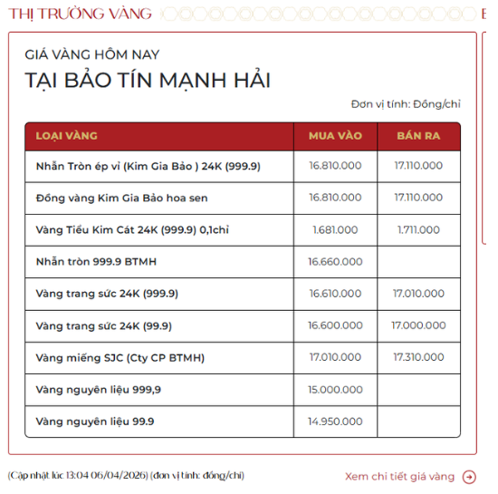 Bảo Tín Mạnh Hải niêm yết giá mua vào đối với vàng nhẫn 999.9 ở mức 166,1 triệu đồng/lượng, giảm 2,2 triệu đồng/lượng so với hôm qua.