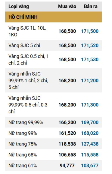 Tương tự, tại PNJ, giá vàng miếng giảm xuống 168,5 – 171,5 triệu đồng/lượng. Giá vàng nhẫn được niêm yết 168,2 – 171,2 triệu đồng/lượng.