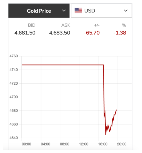 Trên thị trường quốc tế, giá vàng giảm mạnh ngay đầu phiên giao dịch, mất tới 90 USD/ounce xuống quanh mức 4.650 USD/ounce.