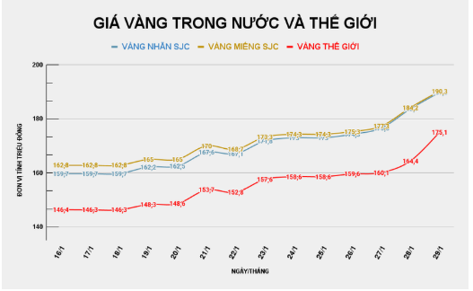 Sáng 29/1, Công ty vàng bạc đá quý Sài Gòn, Doji, Bảo Tín Minh Châu niêm yết giá vàng miếng SJC ở mức 187,3 triệu đồng/lượng ở chiều mua vào, bán ra ở mức 190,3 triệu đồng/lượng. Như vậy, giá vàng trong nước tiếp tục thiết lập đỉnh mới, tăng 8,9 triệu đồng/lượng so với hôm qua (28/1).