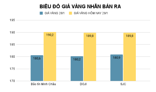 Trong khi đó, tại Bảo Tín Minh Châu, vàng nhẫn được giao dịch ở mức 187,2 – 190,2 triệu đồng/lượng, chênh lệch mua – bán ở ngưỡng 3 triệu đồng/lượng, tăng 9,6 triệu đồng/lượng so với ngày 28/1.