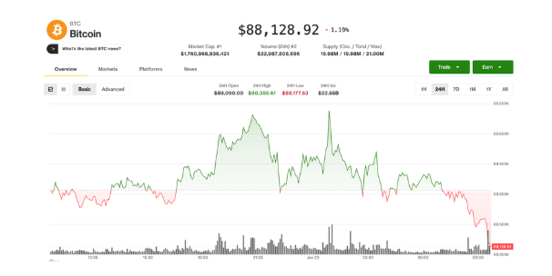 Về giá bitcoin, theo dữ liệu từ Coin Desk, hôm nay (29/1) giá bitcoin giao dịch ở mức 88.128 USD/BTC, giảm 1,2% trong vòng 24h qua. Tính theo tuần, bitcoin đã giảm 1,9% so với 7 ngày trước (89.838 USD/BTC) và tăng 0,4% trong 1 tháng vừa qua (87.809 USD/BTC).