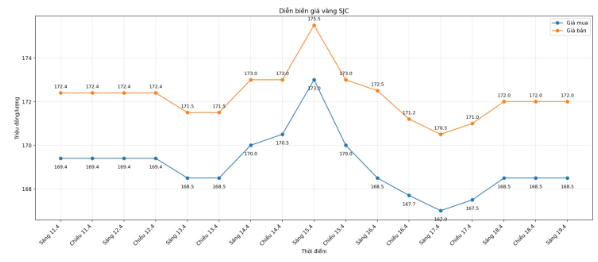 Diễn biến giá vàng miếng SJC những phiên gần đây. Biểu đồ: Như Hạ