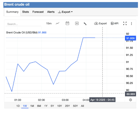 Trading Economics nhận định giá dầu Brent giao kỳ hạn đã giảm mạnh 10% xuống dưới 90 USD/thùng vào thứ Sáu, chạm mức thấp nhất trong gần 5 tuần sau khi Ngoại trưởng Iran Abbas Araghchi tuyên bố rằng eo biển Hormuz hiện đã hoàn toàn mở cửa cho giao thông thương mại trong thời gian ngừng bắn.