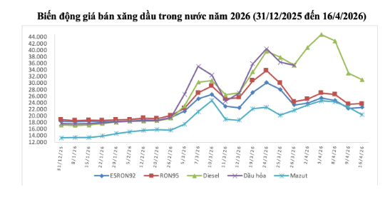 Tổng công ty Xăng dầu Quân đội (Mipecorp) điều chỉnh giá các mặt hàng xăng dầu từ 00h00′ ngày 16/4/2026, mức giá mới cụ thể như sau: