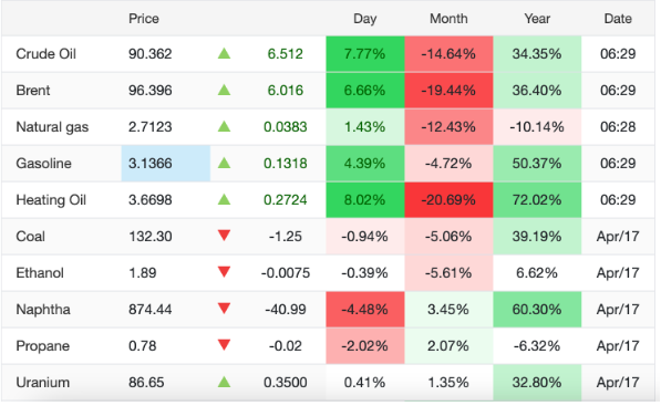 Rạng sáng nay lúc 6 giờ 30 (giờ Việt Nam), giá dầu thô trên thị trường quốc tế ghi nhận mức tăng giá rất mạnh. Trên sàn Trading Economics, giá dầu WTI giao dịch ở mức 90,3 USD/thùng, tăng tới 6,5 USD/thùng, tương ứng với mức tăng hơn 7,7% chỉ trong một ngày