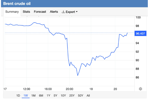 . Cùng thời điểm, dầu thô ngọt nhẹ Brent biển Bắc cũng bật tăng lên ngưỡng 96,4 USD/thùng, tăng 6 USD/thùng, tương đương tăng 6,66%.