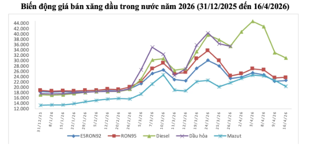Bộ Công Thương cho biết, nhờ các chính sách hỗ trợ, giá xăng dầu bán lẻ của Việt Nam hiện đang ở mức trung bình và thấp hơn khá nhiều so với các nước có chung đường biên giới. Theo tính toán ngày 16/4, trong khi xăng RON tại Việt Nam là 23.761 đồng/lít thì tại Thái Lan lên tới 35.371 đồng/lít, Lào là 47.975 đồng/lít và Trung Quốc là 36.200 đồng/lít. Đối với mặt hàng dầu, giá tại Việt Nam là 31.041 đồng/lít, thấp hơn đáng kể so với Lào (59.573 đồng/lít) hay Campuchia (42.178 đồng/lít).