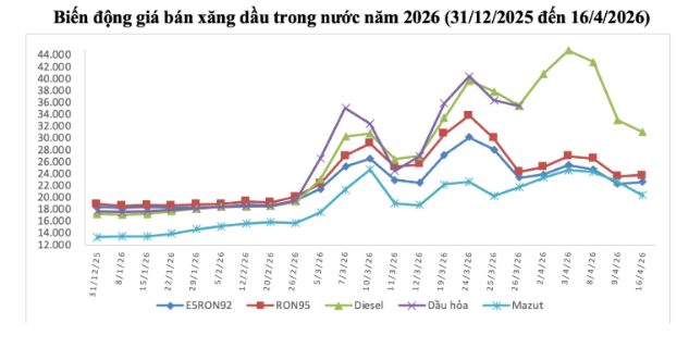 Bộ Công Thương cho biết, nhờ các chính sách hỗ trợ, giá xăng dầu bán lẻ của Việt Nam hiện đang ở mức trung bình và thấp hơn khá nhiều so với các nước có chung đường biên giới. Theo tính toán ngày 16/4, trong khi xăng RON tại Việt Nam là 23.761 đồng/lít thì tại Thái Lan lên tới 35.371 đồng/lít, Lào là 47.975 đồng/lít và Trung Quốc là 36.200 đồng/lít. Đối với mặt hàng dầu, giá tại Việt Nam là 31.041 đồng/lít, thấp hơn đáng kể so với Lào (59.573 đồng/lít) hay Campuchia (42.178 đồng/lít).