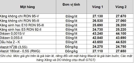+ Kho Bắc Ninh: Dầu Diesel 0,05S: 7.850 đồng/lít; Xăng RON 95 – III: 2.850 đồng/lít.