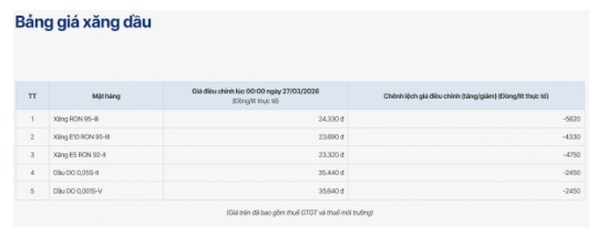 Tại thị trường Việt Nam, giá xăng dầu trong nước được liên Bộ Công Thương – Tài chính điều chỉnh, áp dụng từ 0 giờ ngày 27/3. Cụ thể, xăng E5RON92 giảm 4.749 đồng/lít; xăng RON95 giảm 5.625 đồng/lít; dầu diesel giảm 2.459 đồng/lít; dầu hỏa giảm 971 đồng/lít; dầu mazut tăng 1.503 đồng/kg.