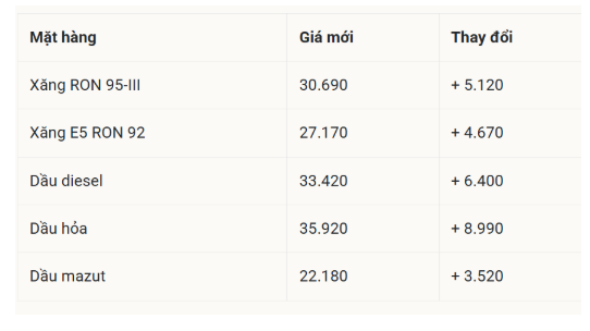 Dầu diesel tăng 6.395 đồng/lít, không cao hơn 33.420 đồng/lít. Dầu hỏa tăng 8.994 đồng/lít, không cao hơn 35.926 đồng/lít. Dầu mazut tăng 3.528 đồng/kg, không cao hơn 22.189 đồng/kg.