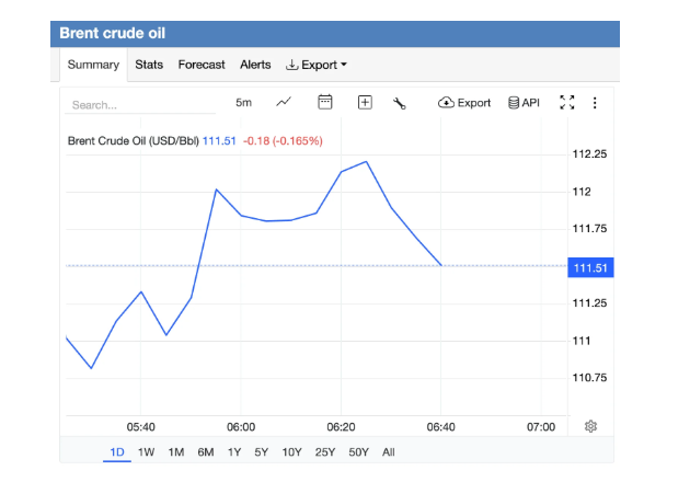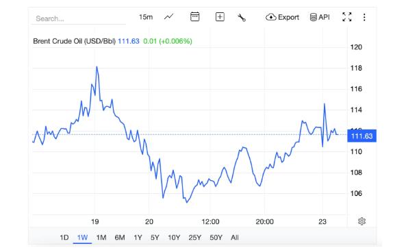Trading Economics ghi nhận giá dầu Brent giao dịch quanh mức 112 USD/thùng vào thứ Hai sau khi tăng lên mức cao nhất là 115 USD vào đầu phiên giao dịch, khi các nhà đầu tư đánh giá tối hậu thư của Tổng thống Donald Trump thúc giục Iran mở lại eo biển Hormuz.
