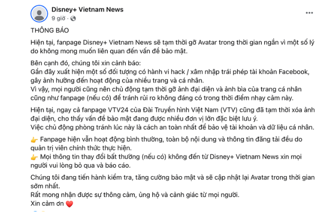 “Mọi thông tin thay đổi bất thường không đến từ Disney+ Vietnam News, xin mọi người vui lòng bỏ qua và báo cáo. Chúng tôi đang kiểm tra, tăng cường bảo mật và sẽ cập nhật lại avatar trong thời gian sớm nhất” – fanpage này thông báo.