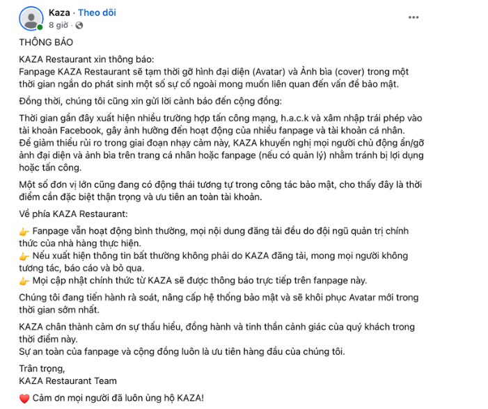 Trang này đồng thời cảnh báo về việc xuất hiện các đối tượng hack, xâm nhập trái phép tài khoản Facebook, gây ảnh hưởng đến hoạt động của nhiều fanpage và cá nhân.