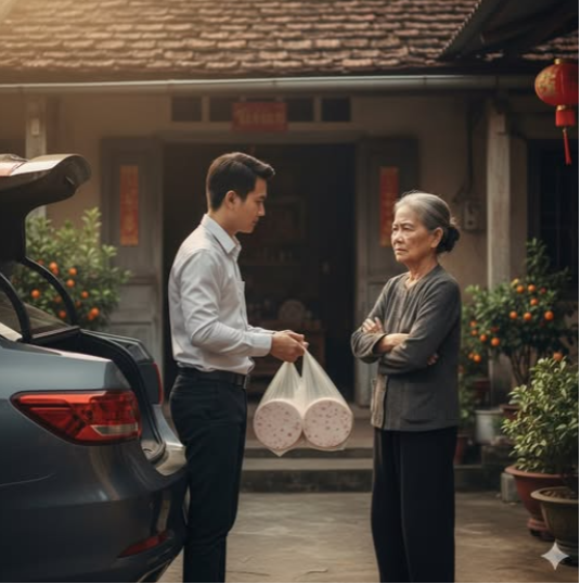 Tôi đỡ đứa bé. Nặng hơn tôi tưởng. Mẹ đặt bó đồ sơ sinh vào tay tôi—cái khăn tắm, bỉm, mũ. Phương đi bên, nước mắt ròng, nói những câu không thành. Huy đi sau, không dám chạm vào lưng tôi. Bước ra đến cửa, tôi quay lại: