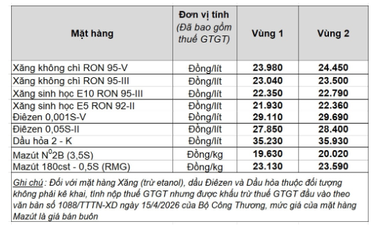 | TT | Mặt hàng | Giá xăng dầu hôm nay 23/4/2026 (Đồng/lít thực tế) | |