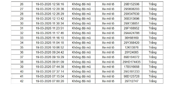 Trên trang fanpage chính thức, Cục Cảnh sát Giao thông đã đăng tải danh sách 42 trường hợp người điều khiển xe mô tô vi phạm trật tự, an toàn giao thông, được phát hiện qua hệ thống camera AI. Danh sách được ghi nhận tại ngã tư Phạm Văn Bạch – Hoàng Quán Chi, với 32 trường hợp không đội mũ bảo hiểm và 10 trường hợp vượt đèn đỏ.