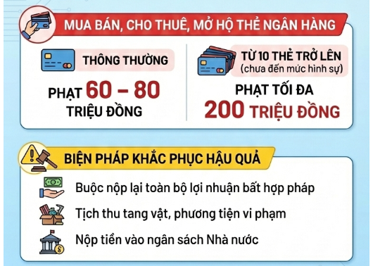 Tương tự, hành vi mua bán, cho thuê, mở hộ thẻ ngân hàng bị phạt 60 – 80 triệu đồng , và có thể tăng lên 200 triệu đồng nếu số lượng từ 10 thẻ trở lên , trong trường hợp chưa đủ yếu tố truy cứu trách nhiệm hình sự.