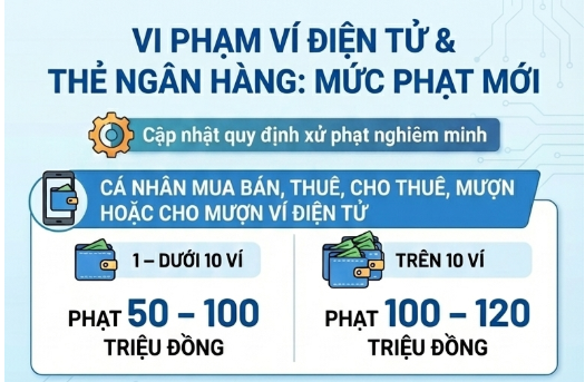 Không chỉ tài khoản ngân hàng, các hành vi vi phạm liên quan đến ví điện tử cũng bị xử phạt nghiêm. Cụ thể, cá nhân mua bán, thuê, cho thuê, mượn hoặc cho mượn từ 1 đến dưới 10 ví điện tử sẽ bị phạt 50 – 100 triệu đồng ; nếu trên 10 ví , mức phạt tăng lên 100 – 120 triệu đồng .
