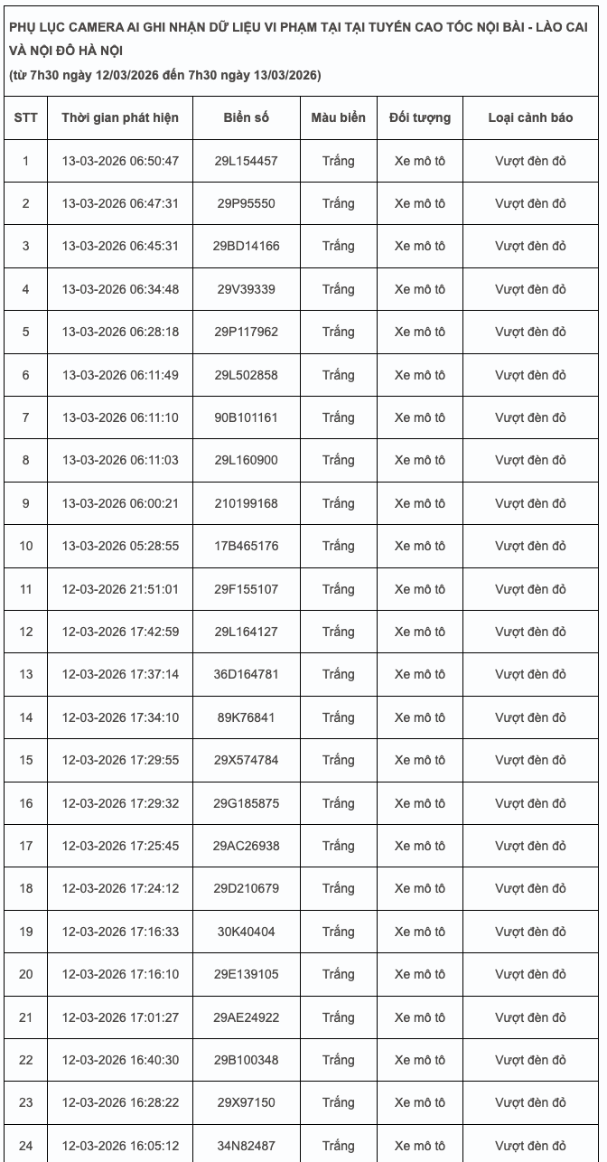 Theo thông tin từ Cục Cảnh sát giao thông (CSGT) – Bộ Công an, trong khoảng từ 7h30 ngày 12/3 đến 7h30 ngày 13/3, hệ thống camera AI đã theo dõi lưu lượng phương tiện trên địa bàn Hà Nội và tuyến cao tốc Nội Bài – Lào Cai.
