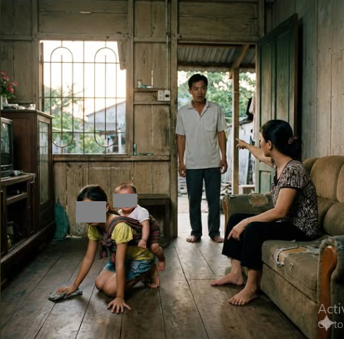 Con gái tôi — tám tuổi — đang quỳ xuống lau sàn. Trên lưng nó cõng em trai mới hai tuổi. Thằng bé ngủ gục, đầu gục vào vai chị. Hai tay con bé run run, nhưng vẫn cố lau cho sạch từng vệt nước.