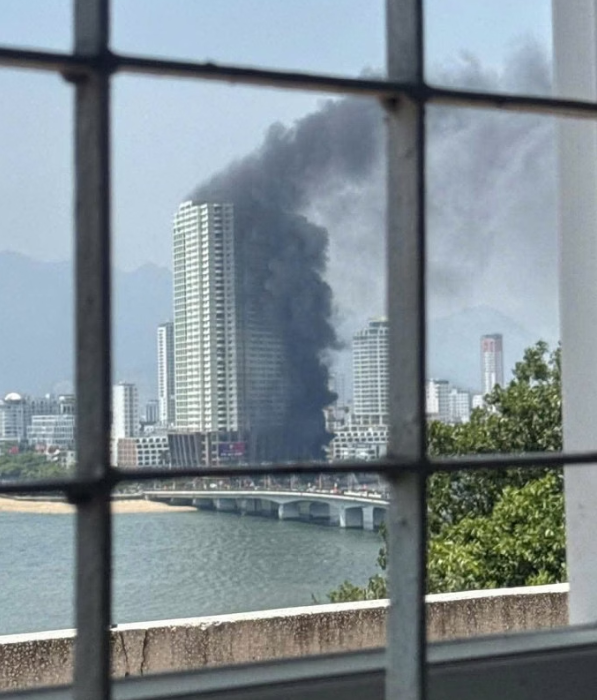 Xe khách 20 chỗ bốc cháy, khói đen bốc nghi ngút bao trùm khách sạn Mường Thanh cạnh bên, du khách và cư dân hốt hoảng, trưa 1/4.